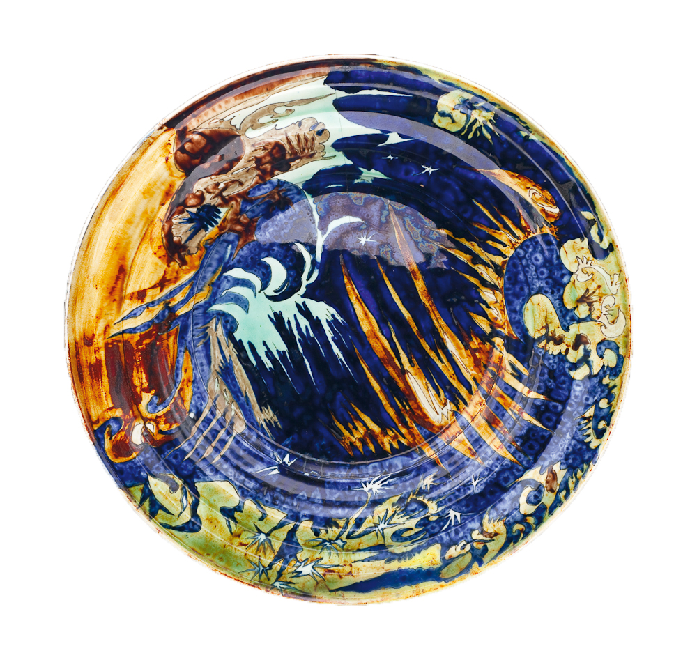 This stirring charger evokes a torrid dreamscape where the underworld of the imagination collides with land, sea, and sky. A lurid green backdrop is blended into a swath of midnight blue, shredded to reveal hellfire beneath. The juxtaposition of colors and formal elements is at once jarring and whimsical, peaceful and alarming.