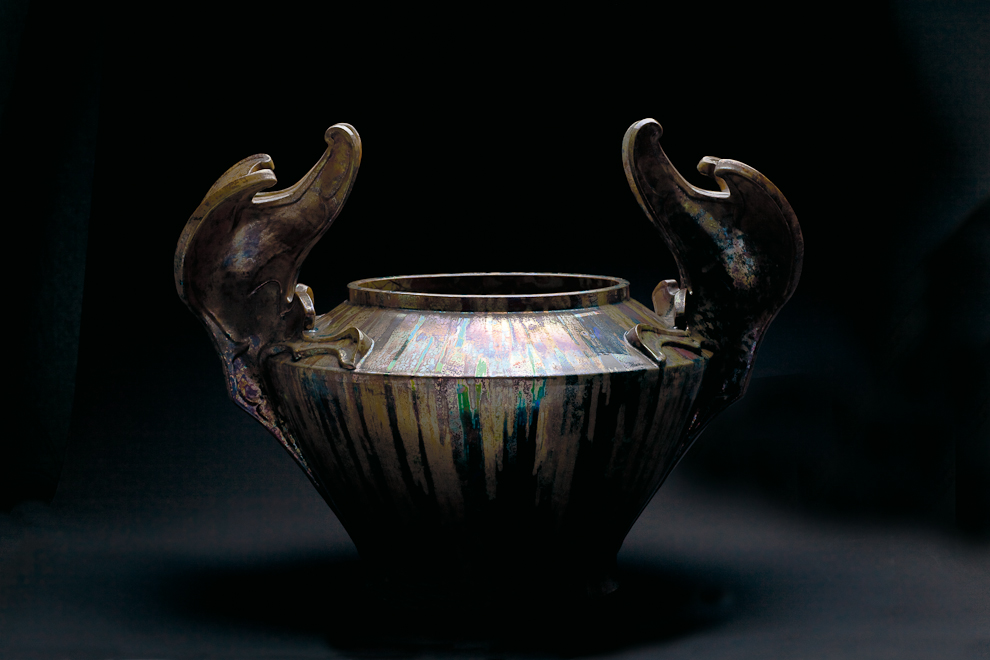 This monumental cachepot is distinguished by two flamboyant sculptural wings and a luster glaze that is predominantly cream, dappled and streaked with splashes of blue, purple, green and gold. Depending on the lighting, the colors change dramatically. In this image, it is clear that the wings are stylized handles that allude to Hispano-Moresque forms such as the Alhambra Vase.