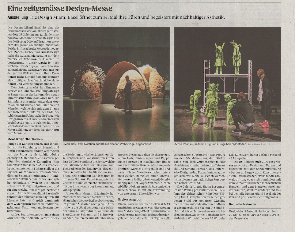 Die Design Miami Basel ist eine der Nebenmessen der Art. Dieses Jahr stellen dort 45 Galerien aus 12 Ländern innovative Ideen und seltene Designs aus. Die DMB setzt 2019 auf Tradition, aktuelles Design und nachhaltige Innovation. Bei der 14. Ausgabe der Messe für modernes Möbel-, Licht- und Kunst-Design steht die Auseinandersetzung mit dem materiellen Erbe unseres Planeten im Vordergrund – dieser Aspekt ist noch wichtiger als der Spagat zwischen Vergangenheit und Gegenwart.