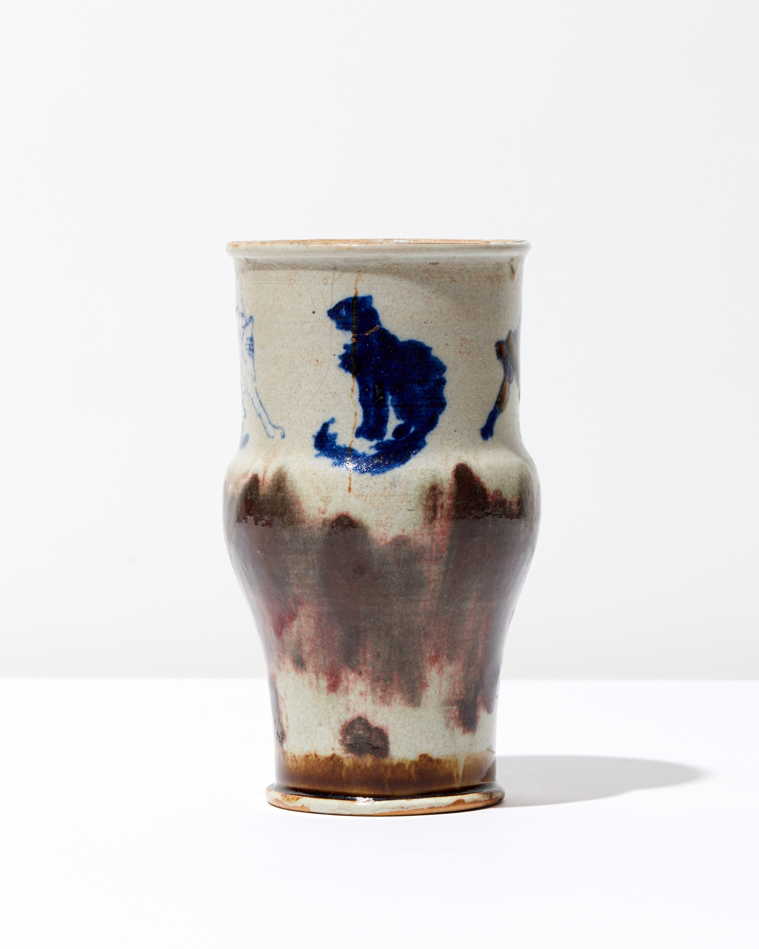 The motifs painted on the sides of this irregularly cylindrical vase are especially remarkable. A group of four cats, one of them white, the other three blue, are humorously painted on the neck of the vase. Two of them are playing. Their elegant and slim silhouettes betray the deep influence of Japanese and Chinese art on ceramist Enerst Chaplet. His atelier indeed specialized in Japanese-inspired designs, en vogue at the time in Western Europe. Below the cats, a brownish glaze partially covers the otherwise off-white background of the vase’s body.