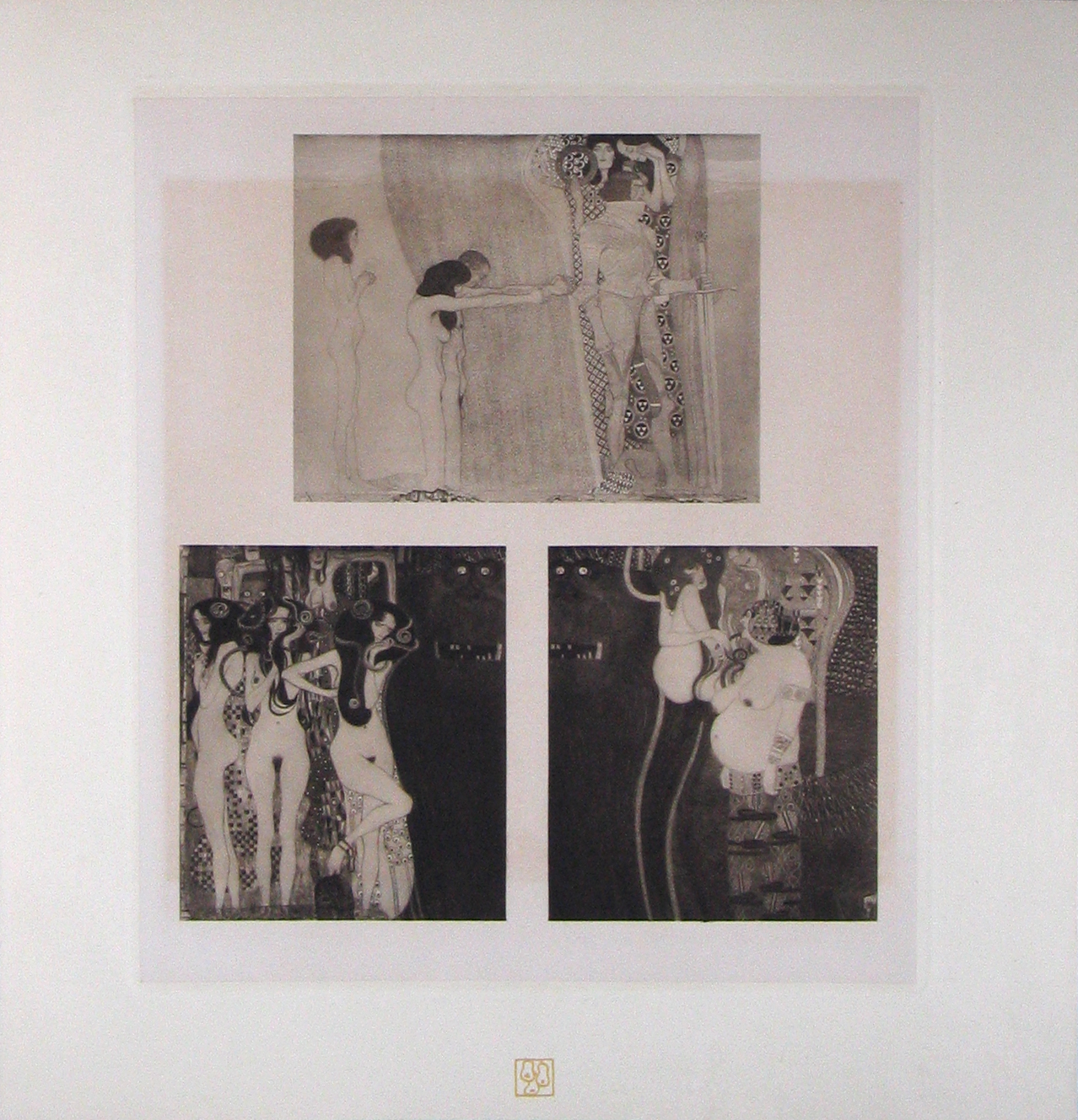 One of two sheets from Das Werk Gustav Klimts representing the six panels of the Beethoven Frieze. The original frieze, created in 1902, was installed in the room on the left side of the Vienna Secession building in connection with an exhibition of Max Klinger's statue of Beethoven. In its entirety the frieze had a complex iconographic program that depicts mankind in a search for happiness that leads him through a minefield of sin and folly but is eventually rewarded with Joy (Freude), represented by the ecstatic union of a naked man and woman. The couple is surrounded by a choir of angels, similar in concept to those who surround the Virgin and Child in Majesty by Duccio di Buoninsegna in the main panel of Maessta Altarpiece, from the Sienna Cathedral (and in many similar medieval compositions). The bodies of the joyful couple are highlighted by an area of heavenly gold that is activated with a swirling texture and embodiments of the divine. Klimt's work is a paraphrase of Beethoven's Ninth Symphony, which ends with the Ode to Joy, a poem by Friedrich Schiller (1785). The final words of the poem are "Joy, beautiful spark of Gods."