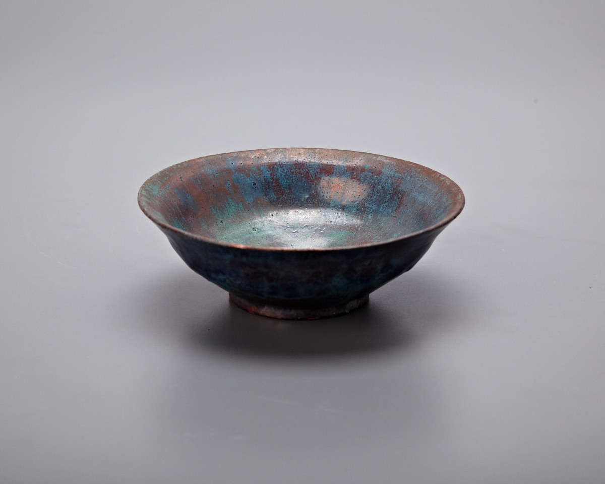 This small bowl was made at one of the historical Royal Delft factories in 1910. It is irregularly covered with blue, green and pink glaze drops that suggest the influence of Impressionist paintings. The application of colorful glaze against a dark background painted in a brownish glaze reinforces the impression that the space of the bowl is treated like a painter’s canvas. Its smooth and shiny surface, as well as its perfect dimensions, makes it an exquisite piece of earthenware. A mysterious element of the bowl is the Pi symbol painted under the bowl’s foot, below the Delft inscription.