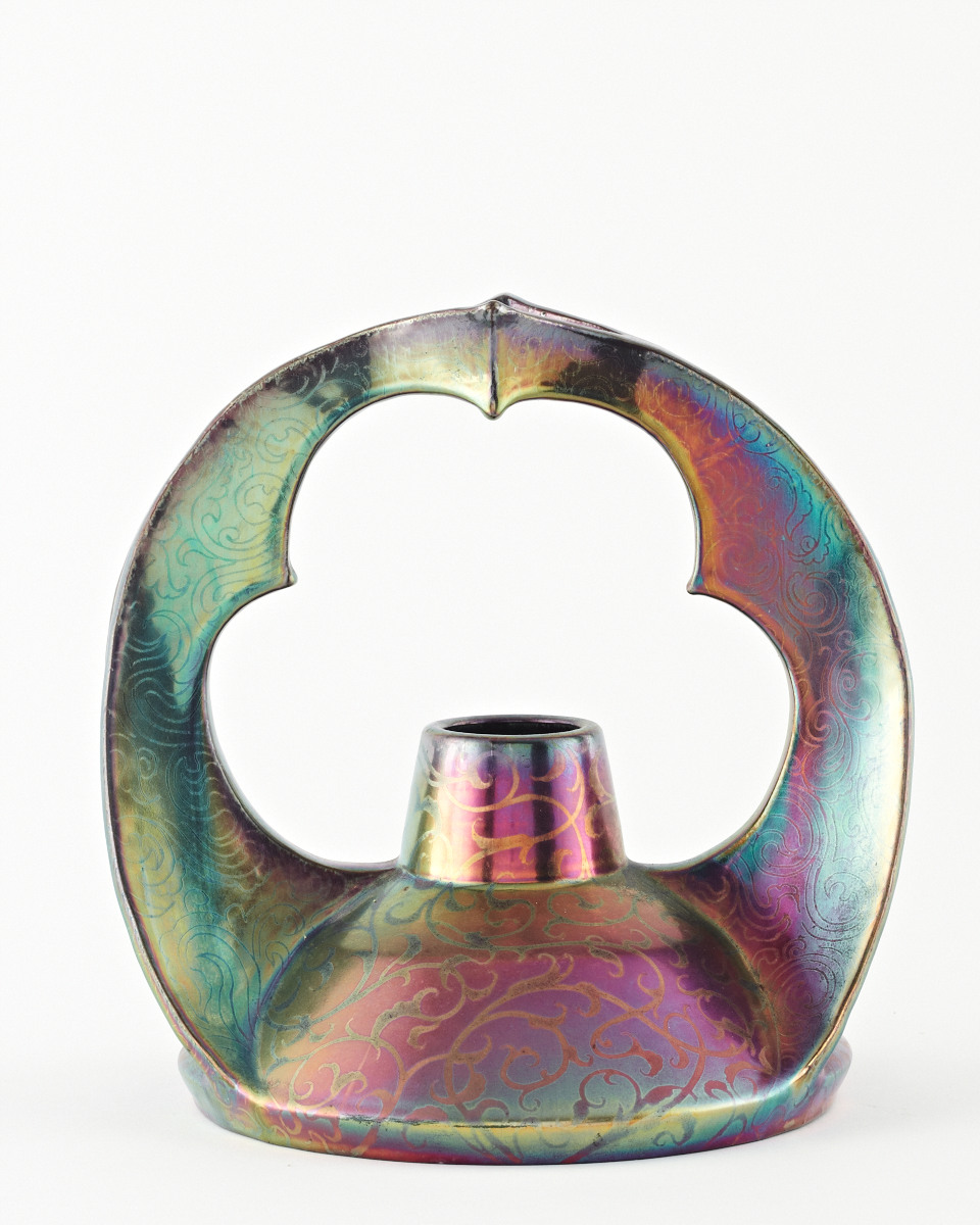Delphin Massier’s Quadrifoil vase is composed of two main components: the bell shaped body of a vase with a tall cylindrical neck, and two flat arms emerging from the body that meet in the air above it, forming the cutout shape of a Gothic quatrefoil. Where these two arms meet at the highest point of the work, they both flare out, each splitting into two planes that come together to form a four sided opening. This complex structure is glazed with magnificently iridescent shades of purple, blue, and orange, colors which have been overlaid with an intricate arabesque patterning. This striking coloration and the unique silhouette combine to form a truly unique ceramic object in this piece.