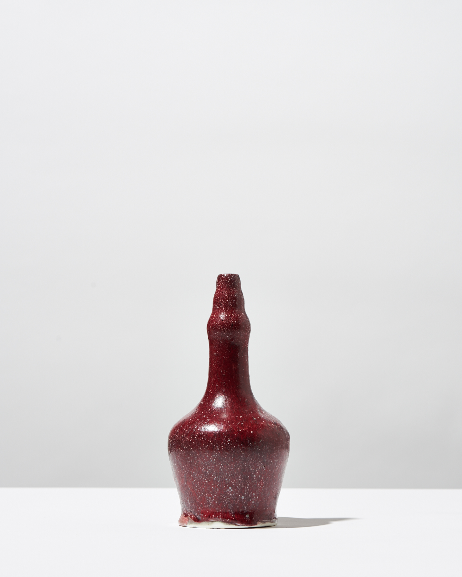 Ernest Chaplet, famous ceramist whose international reputation was sealed after winning a gold medal at the Paris Universal Exposition, completed this stoneware bottle by the end of his career. The blood red glaze (Sang de boeuf, or beef blood) used to adorn the surface of the object immediately catches the viewer’s attention. His production of this particular glaze was itself an achievement. The bottle’s texture remains coarse despite the application of glaze, creating a visually and texturally interesting surface. The three rings preceding the vase’s mouth, as well as its elongated neck, also distinguish this vase from more traditional shapes.